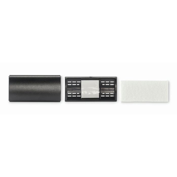 Ambientador de carro com tampa de alumínio e clipe de ABS, projetado para o fixar na grelha de ventilação. Inclui uma inserção de feltro rPET, desenhada para aplicar líquido aromatizante, o qual não está incluído. O formato compacto facilita o uso em frotas, veículos de empresa ou brindes de fidelização. Opção prática para campanhas de marca em concessionários, oficinas ou rent-a-car.