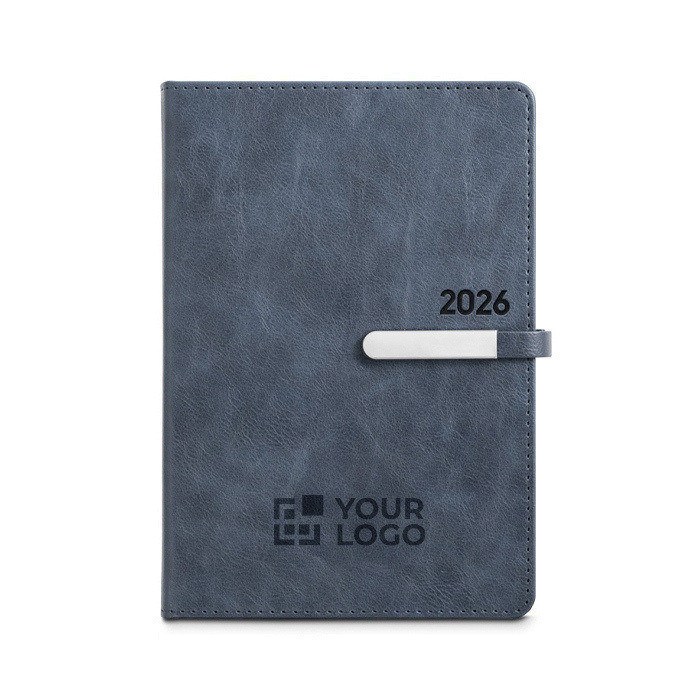 Esta agenda com logo de tamanho A5 é o complemento ideal para controlar as tarefas diárias. Inclui ainda um prático suporte para a caneta que vem incluída.