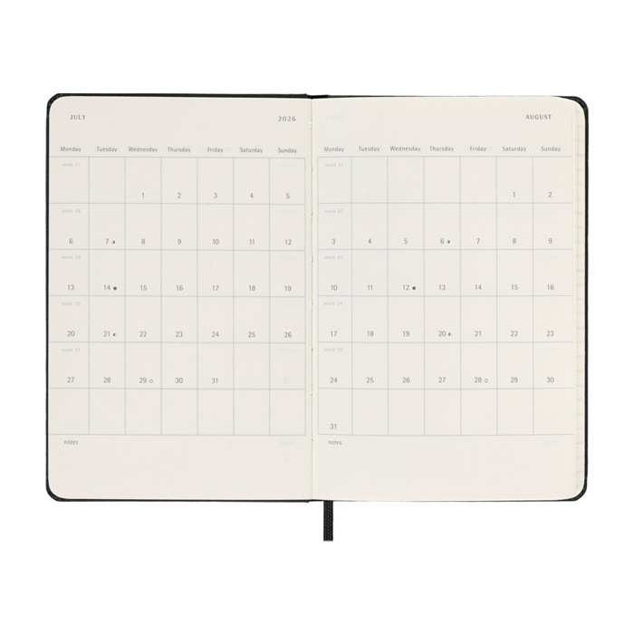 Planeie cada dia ao pormenor com a agenda diária de 12 meses com capa dura Moleskine. Datada de janeiro a dezembro de 2026, esta agenda de bolso tem o formato de um dia por página, para que disponha de espaço suficiente para anotar eventos, compromissos, tarefas pendentes, lembretes e planos. Ao longo do ano, transforma-se num registo físico diário de tudo o que realizou. Inclui papel cor de marfim isento de ácido, um fecho elástico preto, um marcador de página em fita, um bolso interior expansível a condizer e autocolantes para personalização, bem como autocolantes do ano para a lombada.