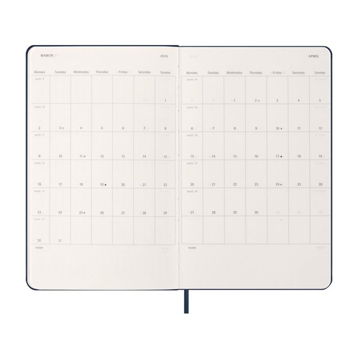 Agenda semanal de capa dura com papel marfim isento de ácido, pensada para o(a) acompanhar no planeamento de janeiro a dezembro de 2026. Apresenta a semana completa numa página e, na oposta, um espaço claro para notas, facilitando o acompanhamento de tarefas e reuniões. Inclui vistas anual e mensal, secções de planeamento e autocolantes para personalização. Inclui fecho elástico, fita marcadora e bolso interior extensível para guardar cartões ou documentos. Uma opção prática para ações de RH, eventos e ofertas de empresa com logótipo.