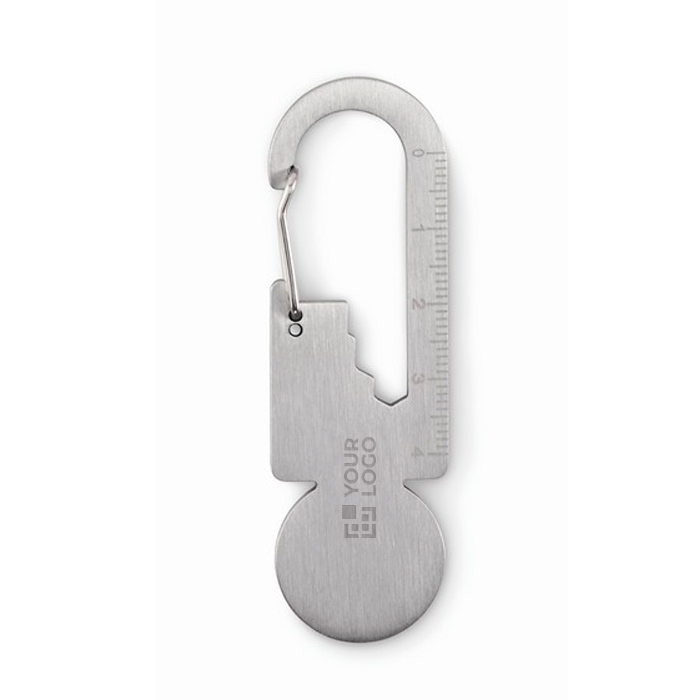 Porta-chaves de aço inoxidável reciclado (90% de aço inoxidável reciclado e 10% de aço inoxidável) para o carrinho de compras, com ferramenta multifunções que inclui abre-caricas e régua.