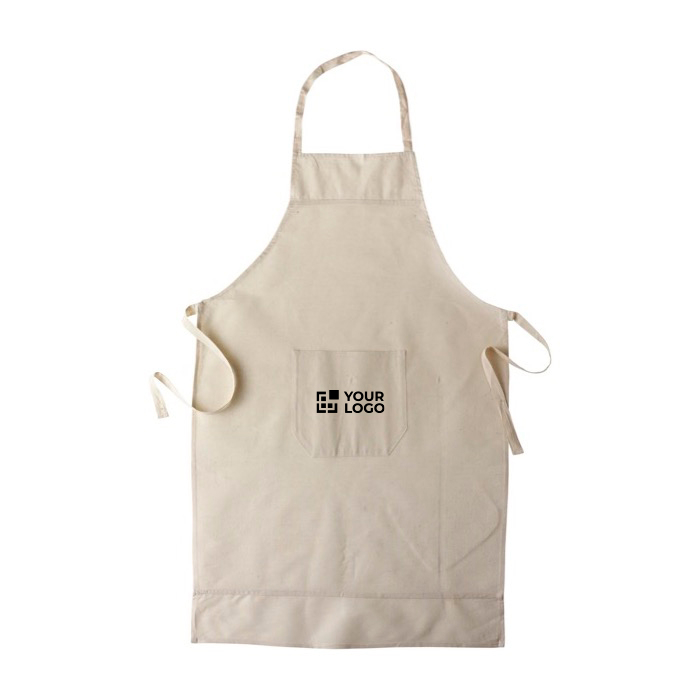 Avental de algodão com bolso central. Leve, prático e personalizável, ideal para eventos de cozinha, feiras gastronómicas ou negócios do sector.