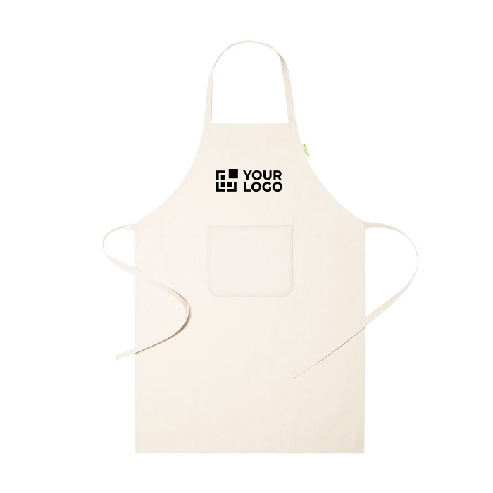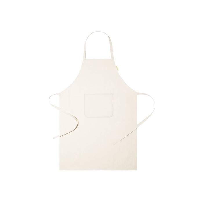 Avental comprido de algodão orgânico com bolso frontal e tiras ajustáveis. Brinde muito apreciado em eventos gastronómicos ou empresas do sector.