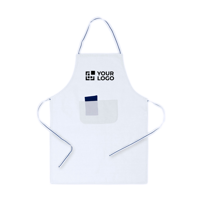 Avental comprido de mescla de algodão e poliéster que é percecionado como um brinde de alta qualidade. Com bolso frontal duplo e tiras ajustáveis bicolores.