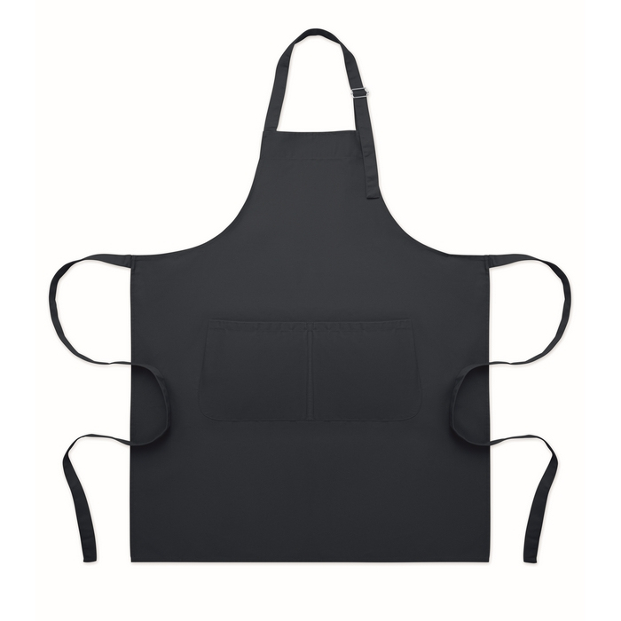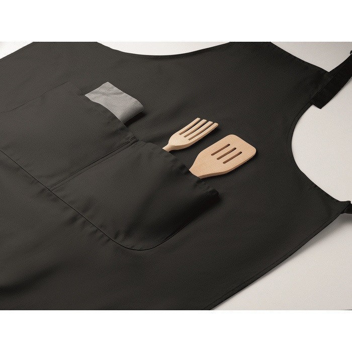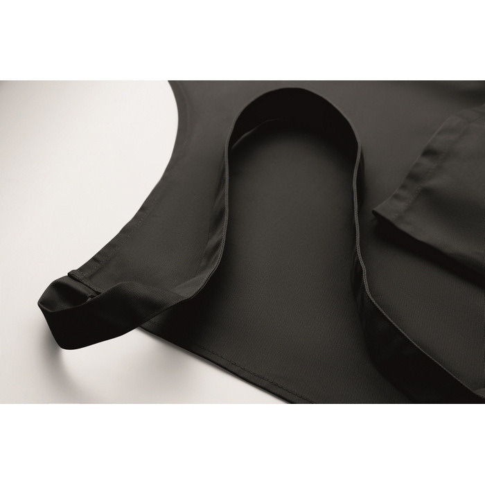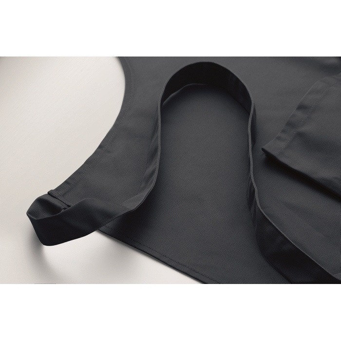 Avental de cozinha comprido de polialgodão de 240 g/m2 (35% algodão, 65% poliéster), pensado para uso diário confortável e organizado. Inclui dois bolsos dianteiros para ter à mão utensílios, bloco de notas ou panos. A tira de pescoço é ajustável e fixa-se com uma fivela metálica, facilitando o ajuste a alturas diferentes. O tecido proporciona bom equilíbrio entre resistência e manutenção simples. Adequado para uniformes de equipas em hotelaria, eventos culinários ou ações de marca.
