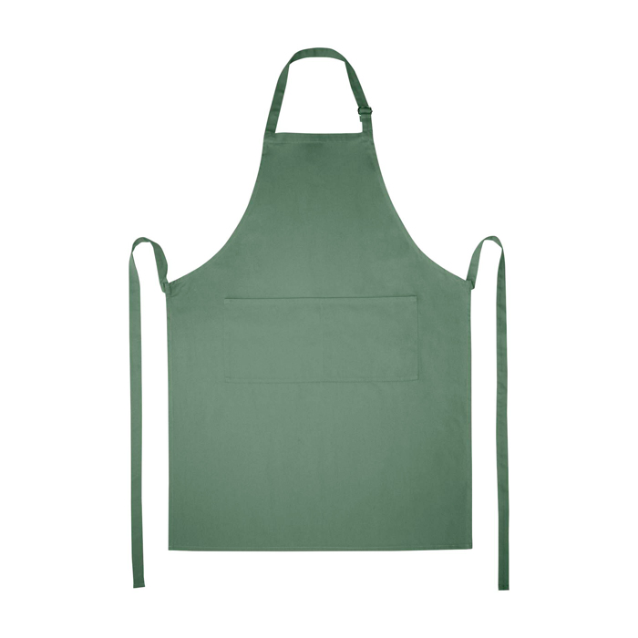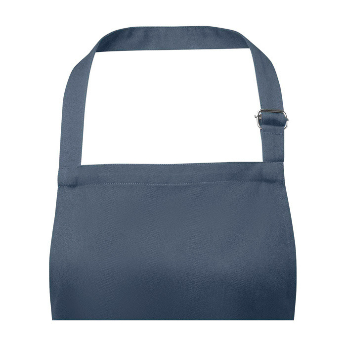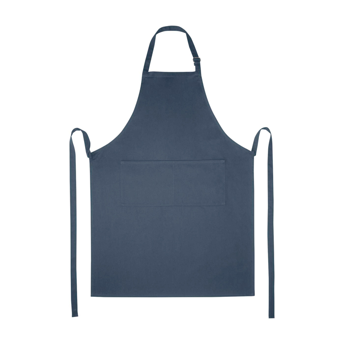 Avental de tecido de sarja resistente (65% poliéster, 35% algodão), dois bolsos, ajustável com fivela ao pescoço e fecho de atar.