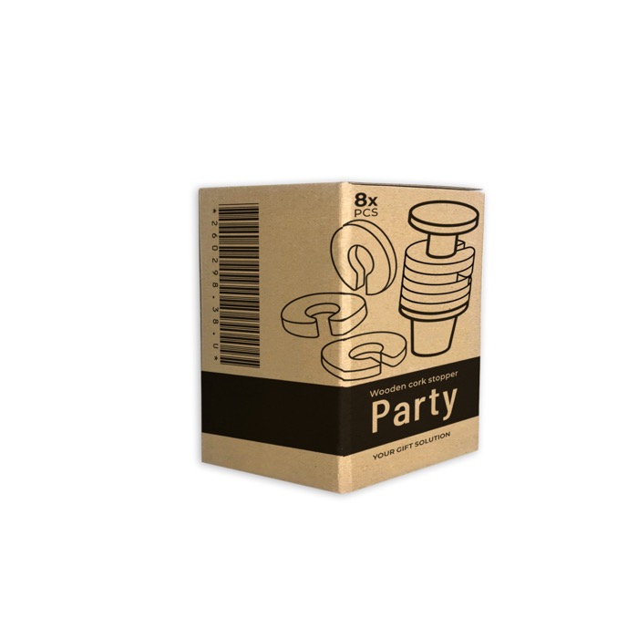 Rolha para garrafa em cortiça e madeira com superfície superior em bambu, pensado para fechar a garrafa e ajudar a organizar as bebidas em reuniões. Inclui anéis de silicone coloridos que funcionam como identificadores para copos ou cálices, facilitando que cada pessoa reconheça o seu sem confusões. O formato é simples de utilizar e acrescenta um detalhe distintivo em mesas de provas ou celebrações. Opção prática para ações de marca em eventos, na hotelaria ou como brindes empresariais.