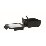 Lancheira de silicone e PP (850 ml). No interior tem um separador. O fecho da tampa também serve como suporte para o telemóvel. Adequada para lava-louça e micro-ondas.