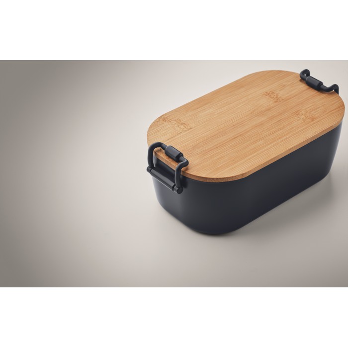 Leve a sua comida com esta lancheira personalizada de 700 ml. PP resistente, tampa de bambu e fecho de duas abas laterais para maior segurança no transporte.