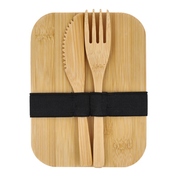 Lancheira de aço inox com tampa de bambu, talheres e fecho elástico