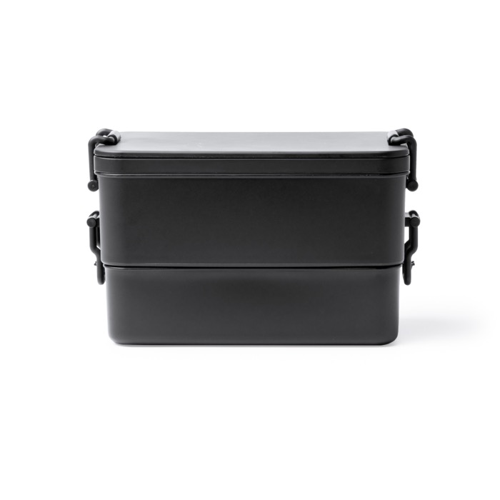Marmita de plástico com sistema de duplo compartimento para separar os alimentos sem os misturar. Os dois recipientes, de tamanhos diferentes, podem ser empilhados um sobre o outro ou guardados encaixados para ocupar menos espaço. Cada compartimento incorpora um fecho de segurança com fivelas laterais, pensado para o transporte diário. A tampa integra um conjunto de talheres preso com suporte de clip, para comer sem depender do escritório ou do evento. Um recurso prático para ações internas, formações ou ofertas com logótipo.