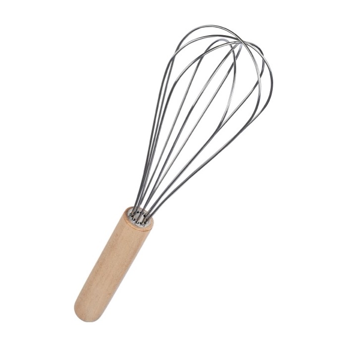 Batedor em aço inoxidável com cabo em madeira de faia, ideal para as tarefas quotidianas de cozinha. Fornecido a granel.