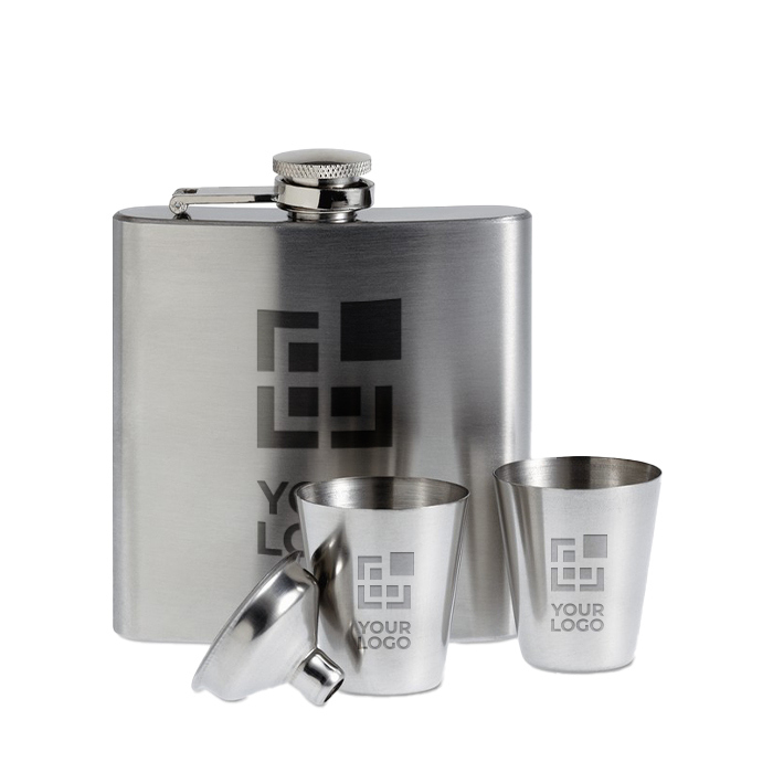 Um frasco de aço inoxidável com capacidade de 175 ml que vem acompanhado de dois copos de shot e um prático funil para facilitar o processo de enchimento de líquido. Apresenta-se numa sofisticada e elegante caixa preta cuja tampa, tal como o frasco e os copos de shot, é personalizável com o logótipo da sua empresa. Um presente original e diferente que, graças ao seu design, se apresenta como uma oferta séria e de qualidade que convida a celebrar e brindar onde e quando quiser os seus pequenos sucessos empresariais e/ou pessoais. Conta com entrega rápida.