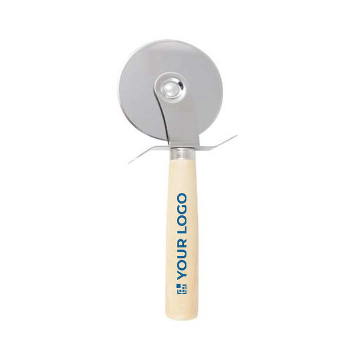 Cortador de pizza feito de aço inoxidável e cabo de madeira.