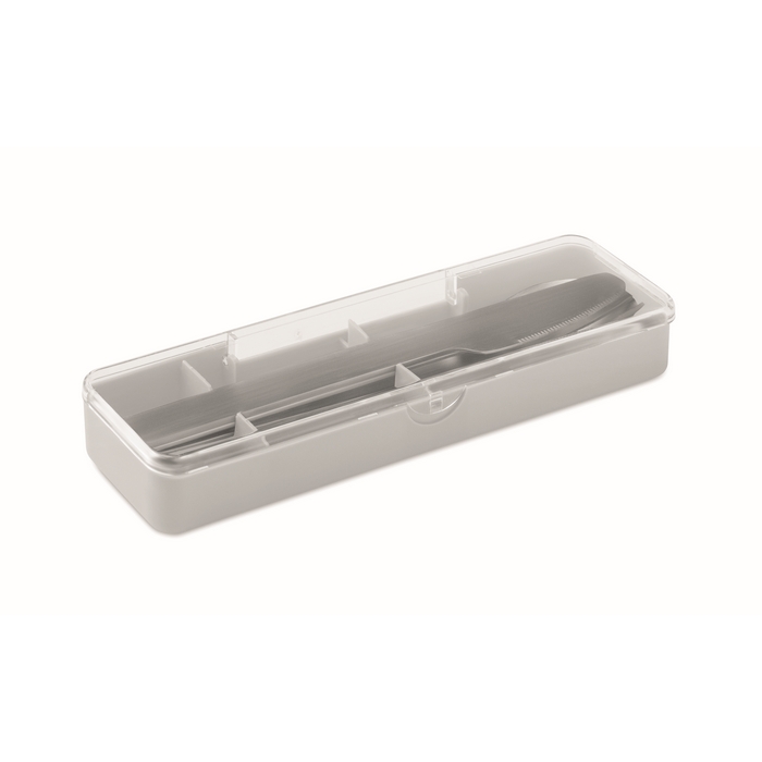 Caixa transparente com um conjunto de talheres brancos de plástico