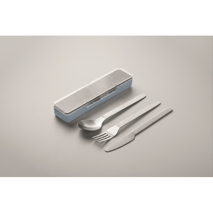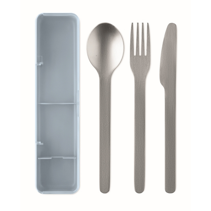 Conjunto de talheres de aço inoxidável com estojo de PP, pensado para uso diário no escritório, eventos ou deslocações. Inclui garfo, faca e colher, tudo organizado num estojo compacto que ajuda a manter as peças protegidas e fáceis de transportar. O aço inoxidável oferece boa resistência e limpeza simples, enquanto o estojo facilita o armazenamento em sacos, mochilas ou gavetas. Opção prática para packs de boas-vindas, ações internas em empresas ou negócios focados no ar livre.