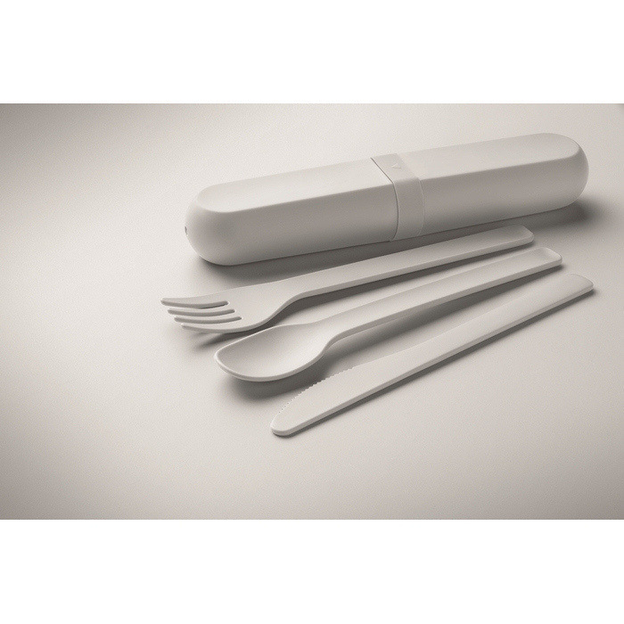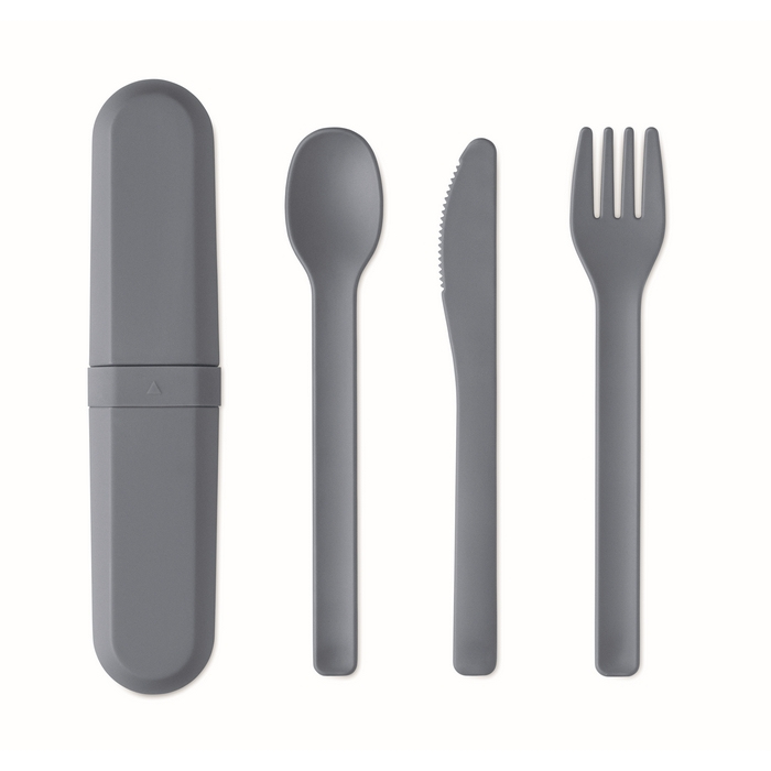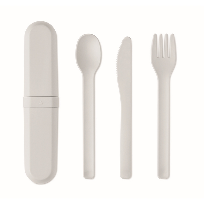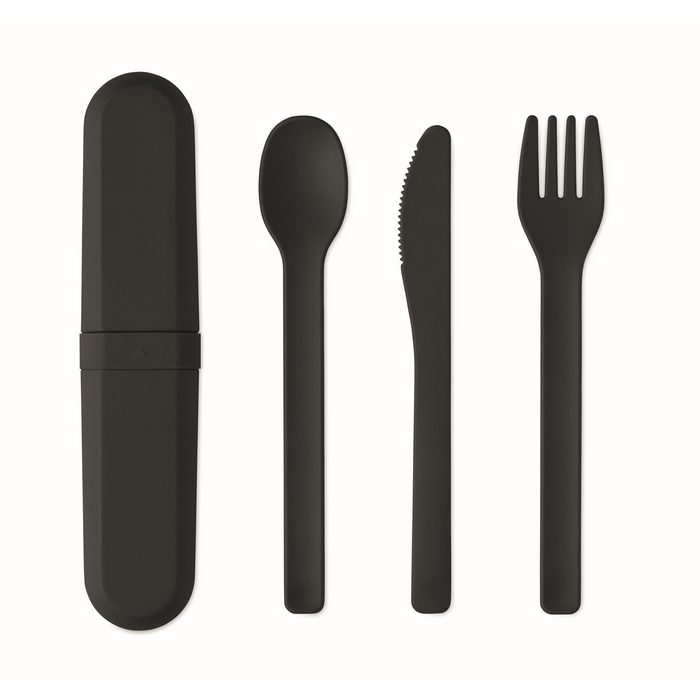 Conjunto de talheres reutilizáveis em estojo compacto de materiais sustentáveis, desenhado para a sua marca estar presente na hora de comer no escritório.