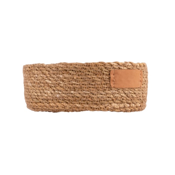 Cesto de aramazenamento, fabricado em algas entrelaçadas com etiqueta em pu para marcação.