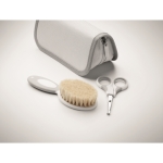 Conjunto de 6 peças para o cuidado do bebé. Inclui: escova de cuidado suave, pente para bebé, escova de dentes, lima de unhas, corta-unhas e tesoura. Apresentado numa bolsa em poliéster 600D.