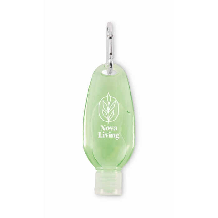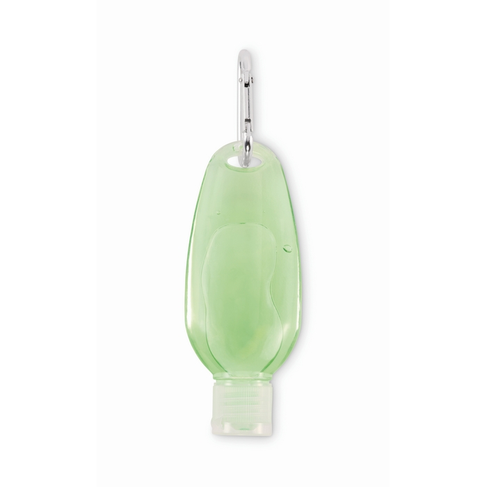 Frasco de PET recarregável de 50 ml com gel de aloé vera com acabamento verde transparente, concebido para levar em deslocações ou no dia a dia. Inclui tampa rebatível de PP para abertura rápida e fecho cómodo. O mosquetão de alumínio permite fixá-lo a mochilas, porta-chaves ou sacos de trabalho para o ter sempre à mão. Formato compacto, fácil de guardar e distribuir em ações. Útil como brinde em viagens corporativas ou eventos.