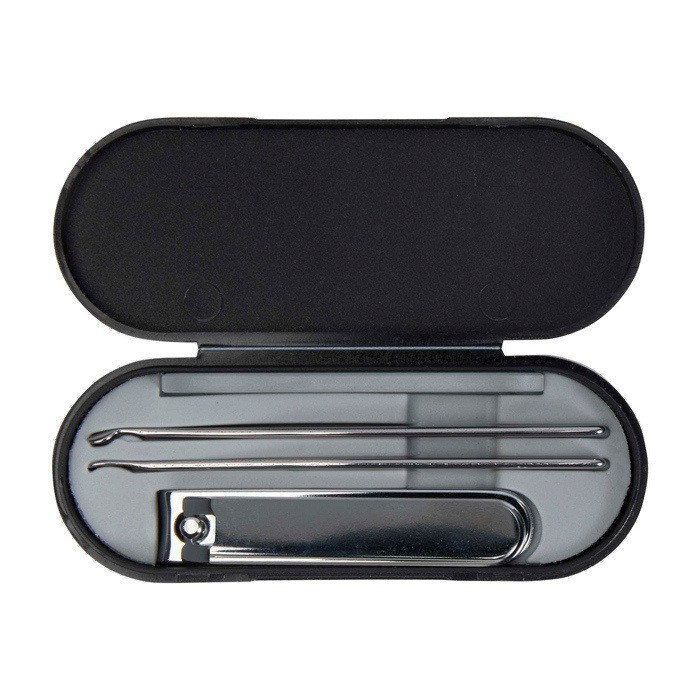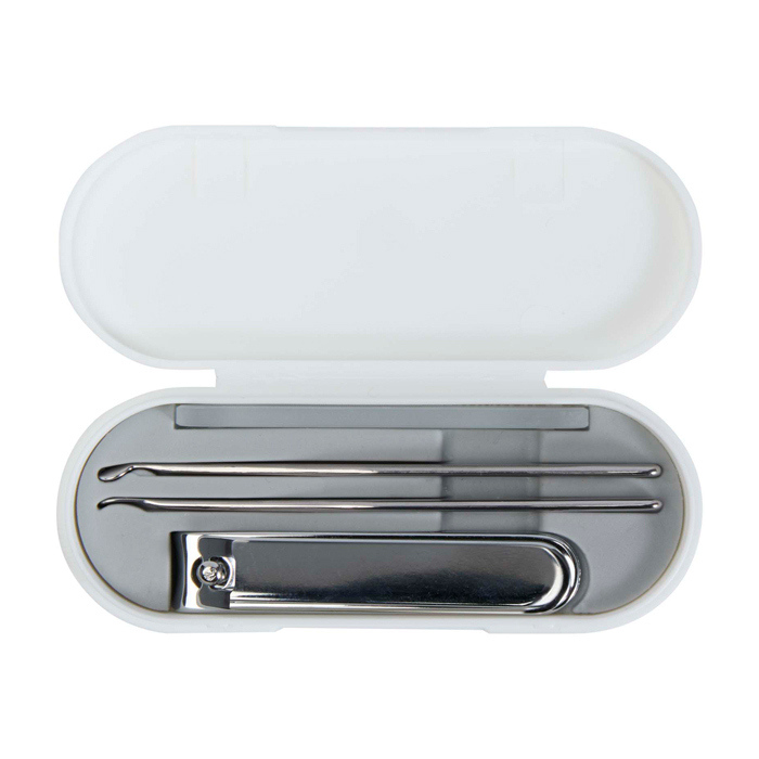 Conjunto de manicure com os acessórios básicos para o cuidado das unhas e higiene pessoal. Inclui uma lima de vidro, corta-unhas resistente, pinça para cutículas e um limpa-ouvidos. Compacto e fácil de transportar, é prático quer em casa como para levar no saco ou em viagem.