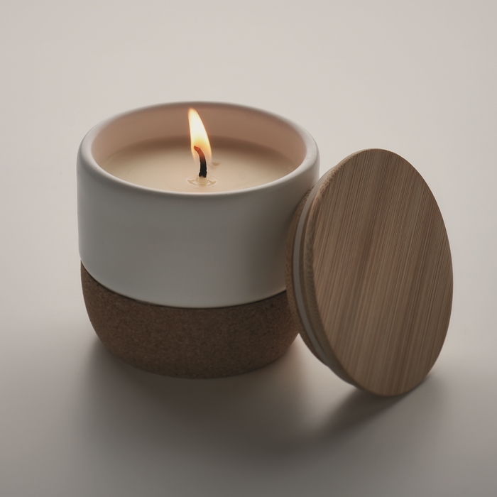 Esta vela com um toque natural com base de cortiça e tampa de bambu é ideal tanto para casa como para o escritório. Além disso, serve como elemento decorativo.