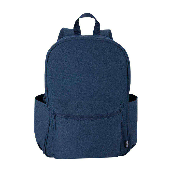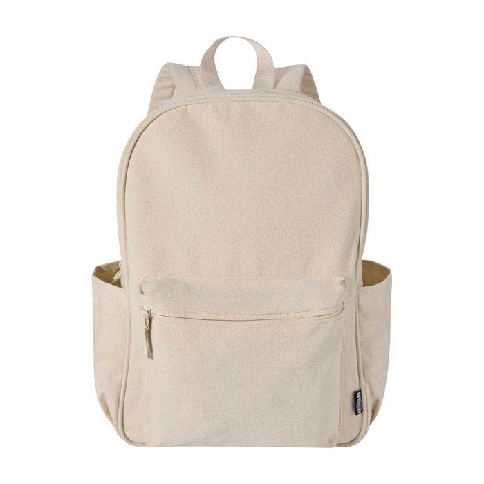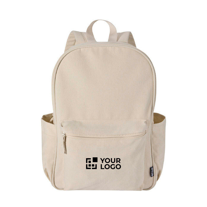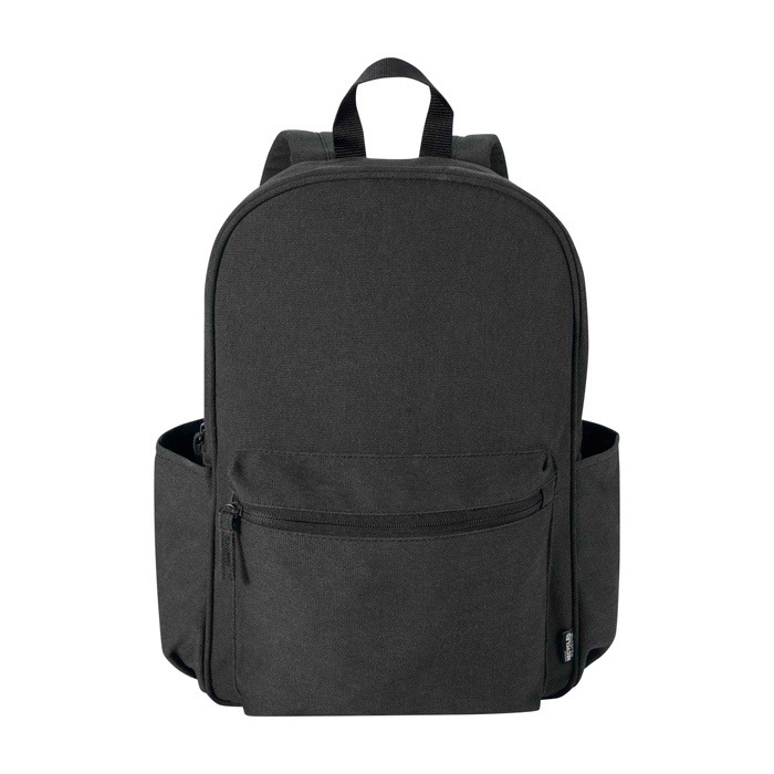 Mochila urbana de lona reciclada hidrófuga com certificação GRS (Global Recycled Standard) e forro de plástico reciclado a condizer. Dispõe de compartimento acolchoado para portátil de 15,6” e bolso acolchoado adicional para proteger o equipamento em deslocações diárias. Inclui bolso frontal com fecho de correr e dois bolsos laterais para organizar acessórios além de costas de malha transpirável e alças ajustáveis para uso confortável. Com 16 L de capacidade, é excelente para ações de RH, eventos e brinde empresarial com logo.