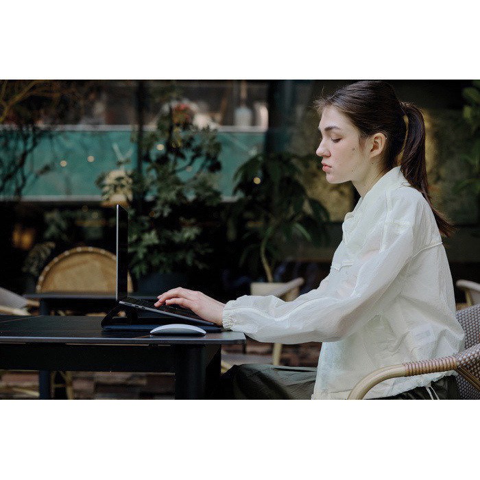 Capa para portátil desenhada para oferecer proteção e comodidade. A sua estrutura permite transformá-la num suporte para portátil com uma inclinação de 4 cm, melhorando a ergonomia e favorecendo a dissipação do calor. Incorpora um bolso traseiro para objetos finos como telemóveis ou documentos, que facilita um armazenamento eficiente. Está fabricada com tecido reciclado com rastreador AWARE™, que garante o uso de material reciclado genuíno. Design registado®.