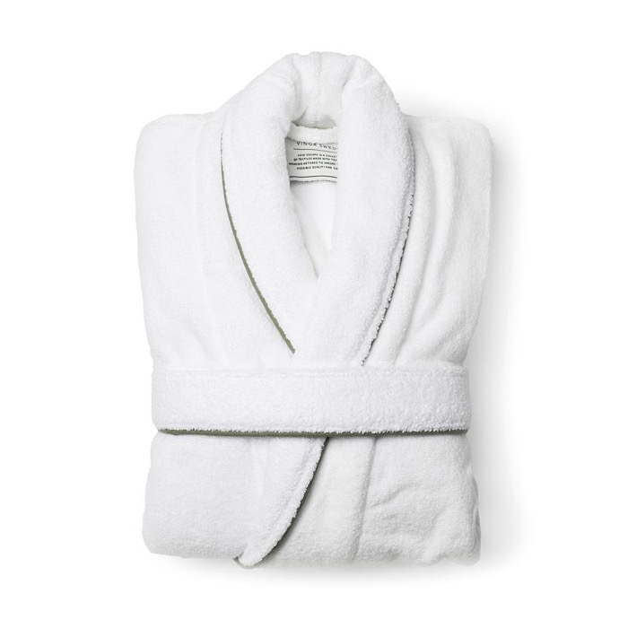 Luxuoso roupão de banho 100% de algodão. O roupão é um modelo clássico com colarinho extra largo e cinto na cintura. Também tem vários detalhes agradáveis como as costuras fechadas e a borda a contrastar no colarinho. É confecionado com uma fibra comprida de algodão com fios não-torcidos. O resultado é um roupão incrivelmente macio que nunca quererá tirar.