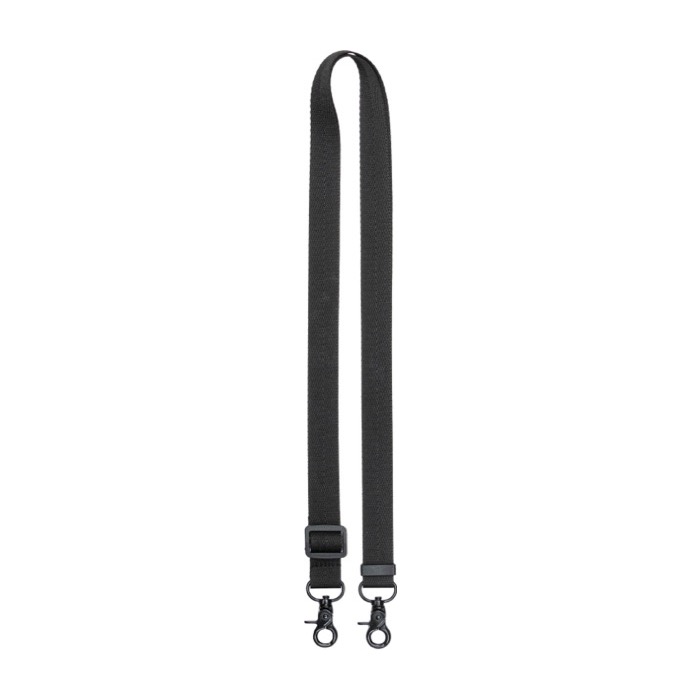 Lanyard de poliéster de plástico reciclado (rPET) concebido para credenciais e chaves em ambientes profissionais. Inclui mosquetões metálicos, fivela de libertação rápida que facilita o abrir e fechar sem tirar o lanyard, o que é prático nos controlos de acesso ou receções. Inclui fivela para melhor ajuste e manuseamento. Adequado para pessoal, visitantes e ações de branding com logo.