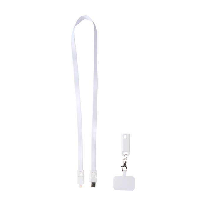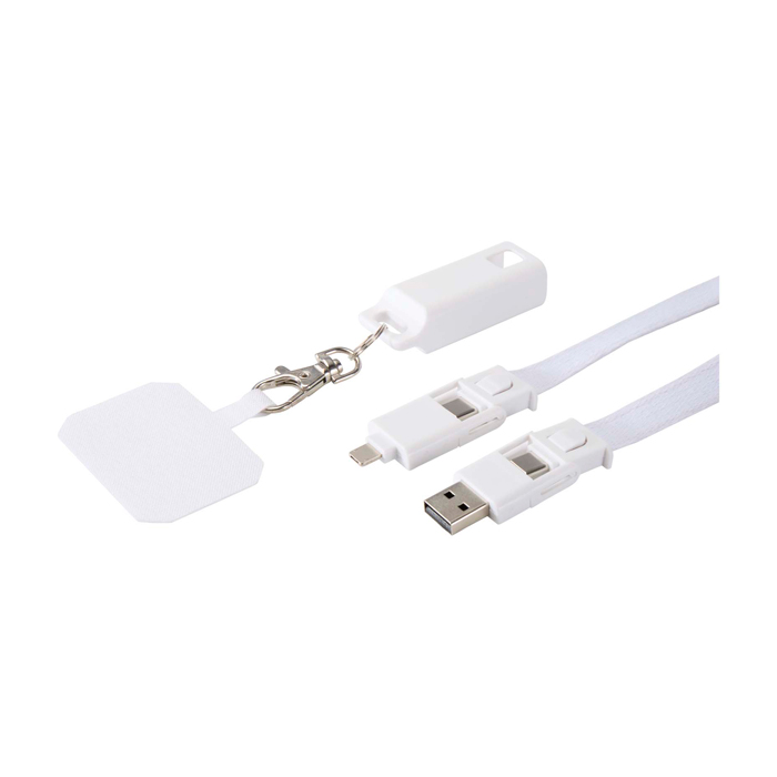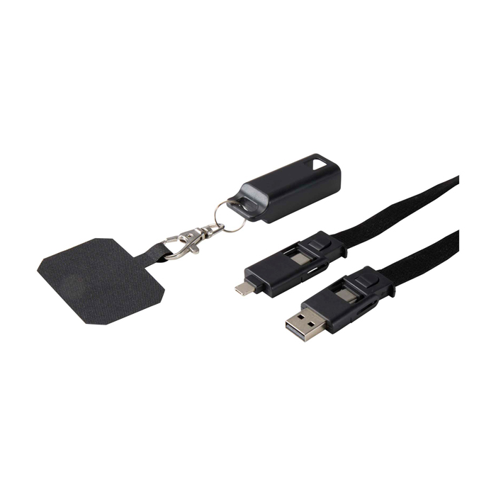 Lanyard para smartphone feito de plástico reciclado e integrado com cabo de carga 5 em 1 de 65 W. Entradas USB-C e USB-A, saídas USB-C, Lightning e micro-USB. Potência suficiente para carregar rapidamente a maioria dos portáteis, tablets e smartphones. Compatível com CarPlay e Android Auto, adequado para uso diário e deslocações.