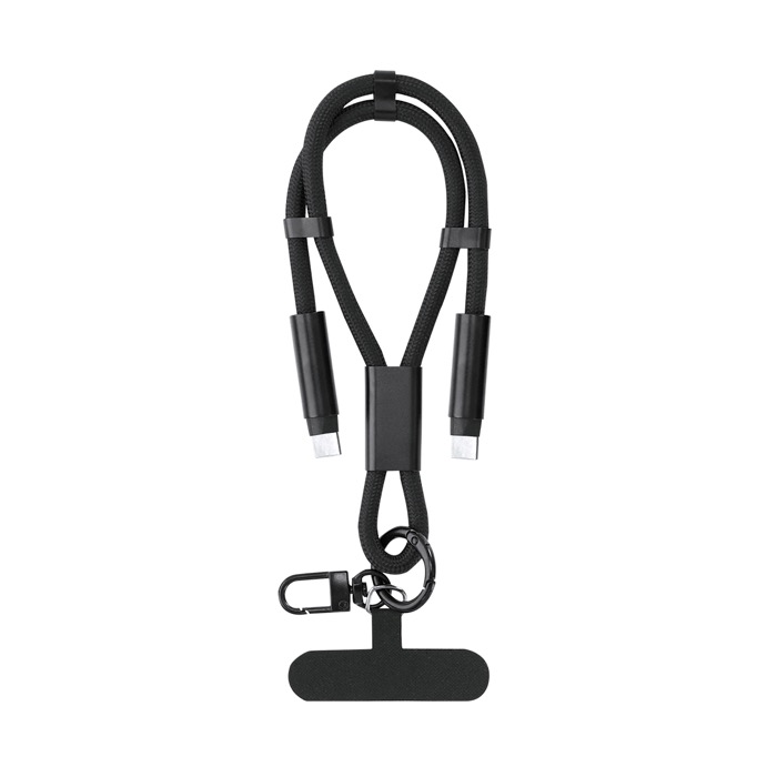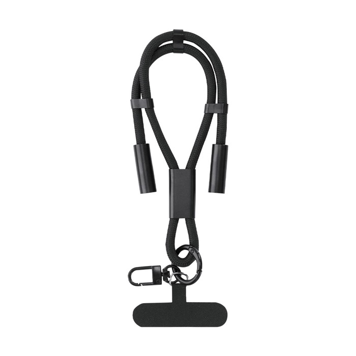 Tira de pulso de poliéster de plástico reciclado com função de suporte para smartphone e cabo carregador incluído. Desenhada para se colocar entre a capa e o telemóvel via acessório de transporte, serve para levar o dispositivo mais seguro no dia a dia. Inclui cordão a condizer, mosquetão metálico giratório preto e regulador para o pulso. Permite carga e transferência de dados com entrada USB-C até 60 W e saídas USB-C. Escolha prática para ações de RH, feiras e eventos corporativos.