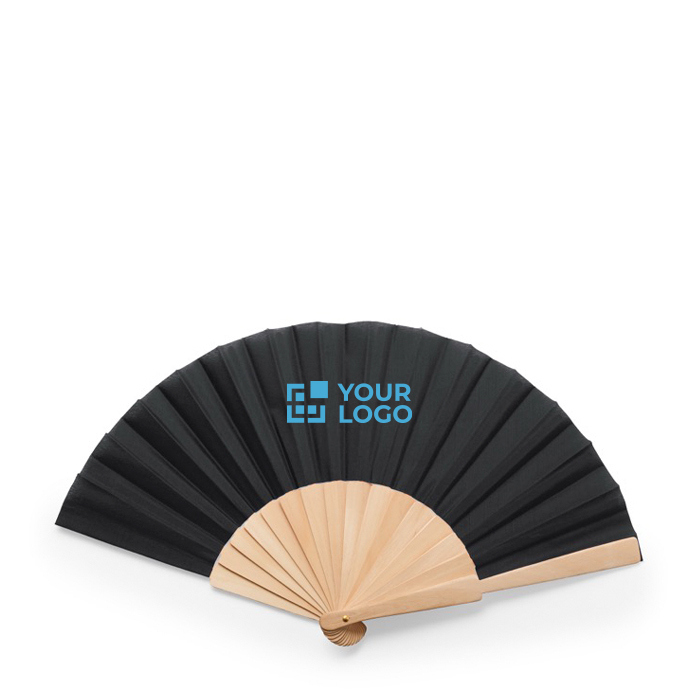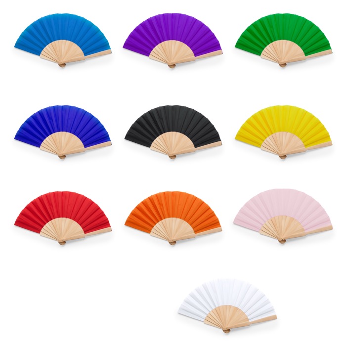 Leque de madeira e tecido. Leve e original, é um brinde empresarial com muito encanto. Ideal para eventos corporativos, celebrações ou campanhas de verão.