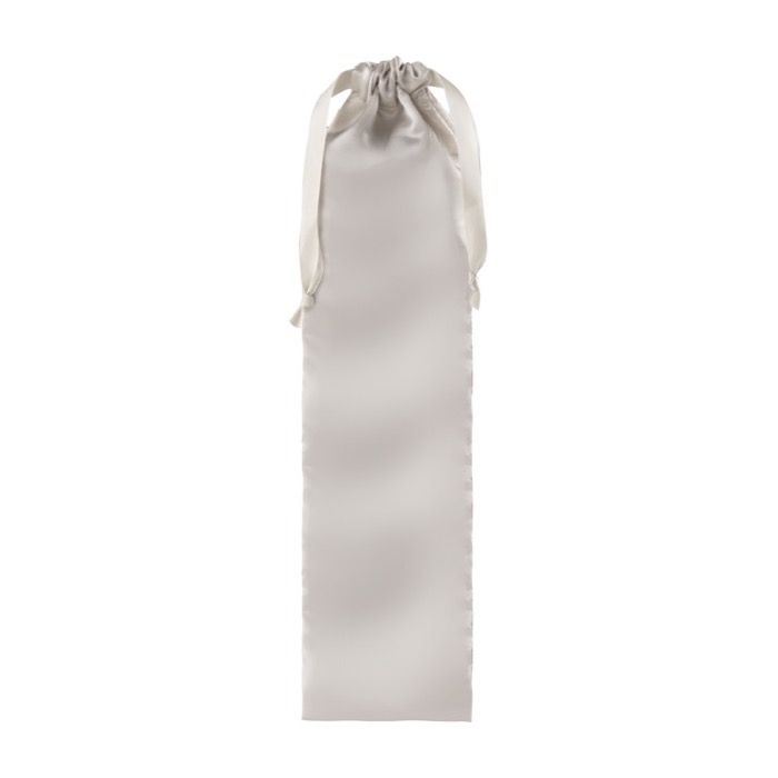 Leque em madeira escura natural e apresentado em bolsa de cetim.