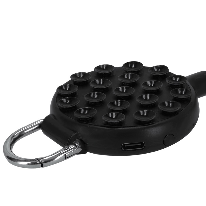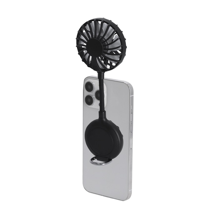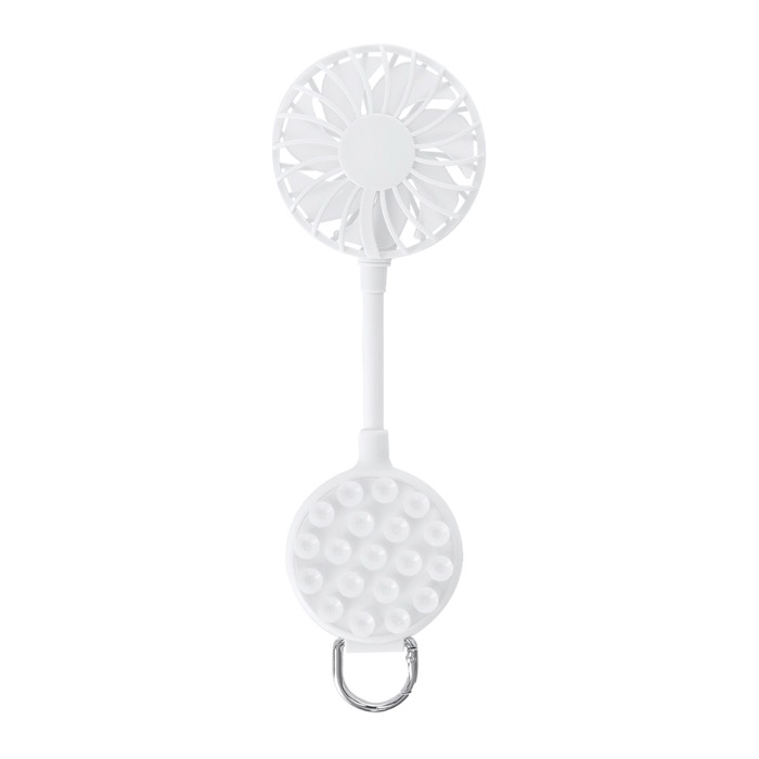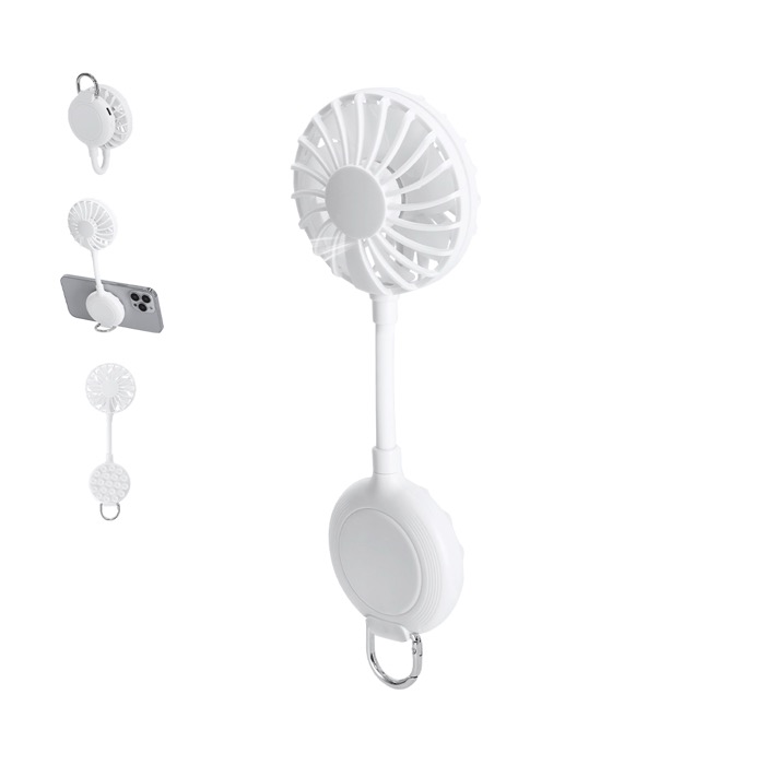 Ventoinha multiposições de plástico de cor sólida com rotação de 360° para orientar o ar de acordo com a situação. Inclui ventosa para fixação do telemóvel e suporte ajustável para colocar o dispositivo com estabilidade na mesa ou superfícies lisas. Dispõe de 3 velocidades reguláveis via botão, bateria recarregável e cabo de carga de USB-A a USB-C a condizer. A base conta com um mosquetão com anel metálico para a levar pendurada. Útil para ações de marca em eventos e escritórios.