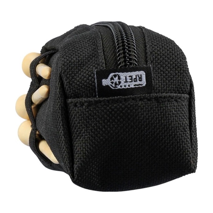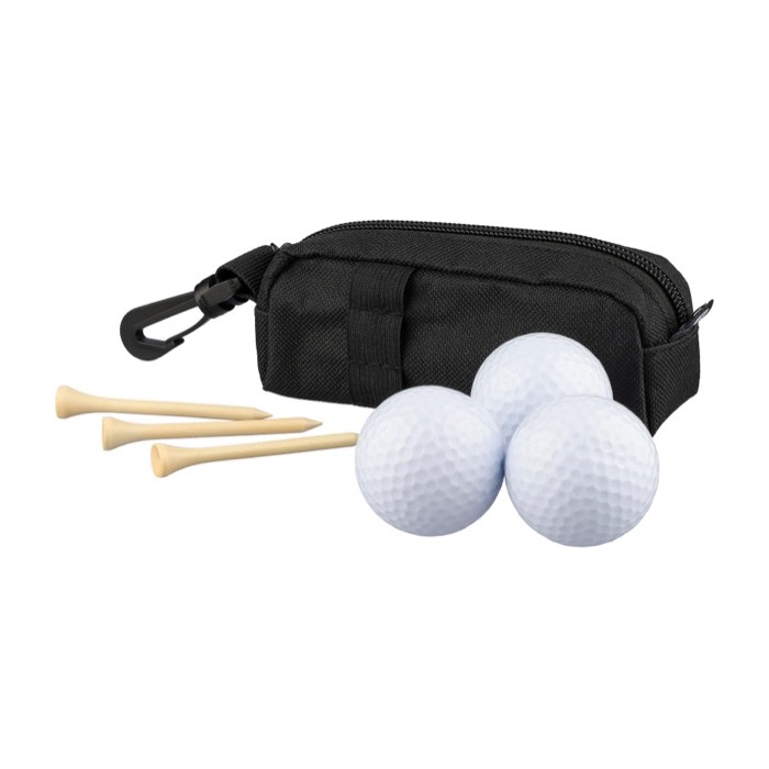 Conjunto de golfe com estojo de plástico reciclado e fecho de correr, desenhado para o levar à mão ou pendurado graças ao mosquetão. Inclui 3 bolas de golfe de treino e 3 tees de madeira de faia, uma combinação prática para sessões rápidas e para reposição no campo. O estojo contém fole, dando-lhe um pouco mais de capacidade e melhor acesso ao conteúdo. Pode ser entregue como brinde em torneios corporativos ou ações de marketing vinculadas ao desporto.