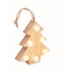 Ornamento de árvore decorado em madeira (80% madeira de choupo e 20% madeira de mato) com 6 luzes LED e corda para pendurar. Inclui 1 pilha CR2032. O madeira é um material natural, a cor do item, o tamanho e a impressão podem variar.