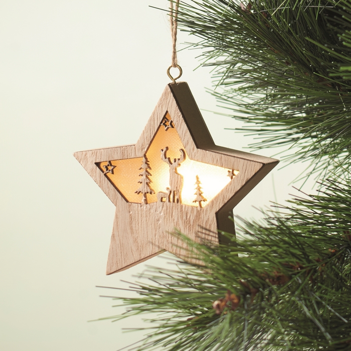 Estrela de Natal de madeira decorada com luz e cordão para pendurar