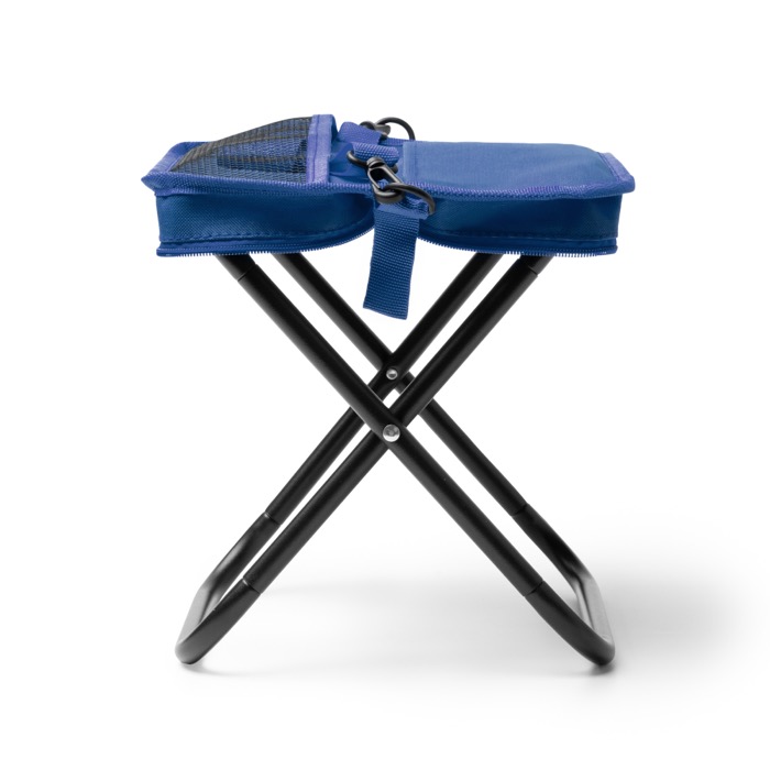 Cadeira dobrável em poliéster reciclado com uma estrutura pensada para uma dobragem rápida e organizada. O mecanismo permite compactá-la dentro da sua capa com fecho de correr, facilitando o armazenamento e o transporte nas deslocações. Inclui uma fita de transporte amovível com mosquetão para a levar ao ombro ou pendurá-la, além de dois bolsos exteriores para manter pequenos acessórios à mão. Uma opção prática para ações de marca em eventos, feiras, formações ou áreas de descanso em empresas.