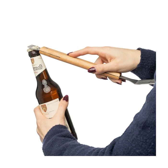 Espátula de churrasco em aço inoxidável com cabo de madeira de faia e abre-cápsulas integrado na extremidade. O formato oferece uma pega confortável e um manuseamento estável ao cozinhar na grelha, enquanto o abre-cápsulas acrescenta um extra prático em serviços de catering ou eventos. Opção interessante para personalização com logótipo e utilização como oferta em campanhas de verão, feiras ou atividades internas.