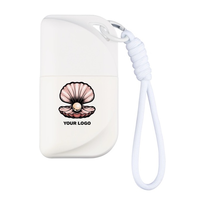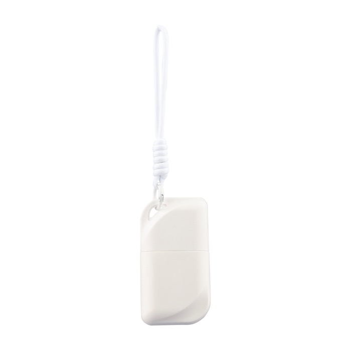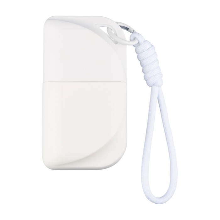 Frasco de plástico com 50 ml de protetor solar FPS50, (fator de proteção solar 50), pensado para uso diário no exterior. Inclui tira de pulso a condizer e mosquetão metálico para o fixar à mochila, saco ou lanyard e tê-lo sempre à mão. O folheto está colado ao verso para manter a informação acessível durante a distribuição. O formato compacto facilita ações de amostra e entregas rápidas em pontos de atenção, eventos, receções ou campanhas de verão.