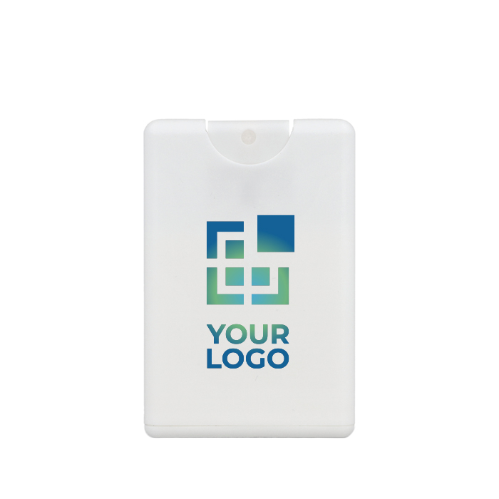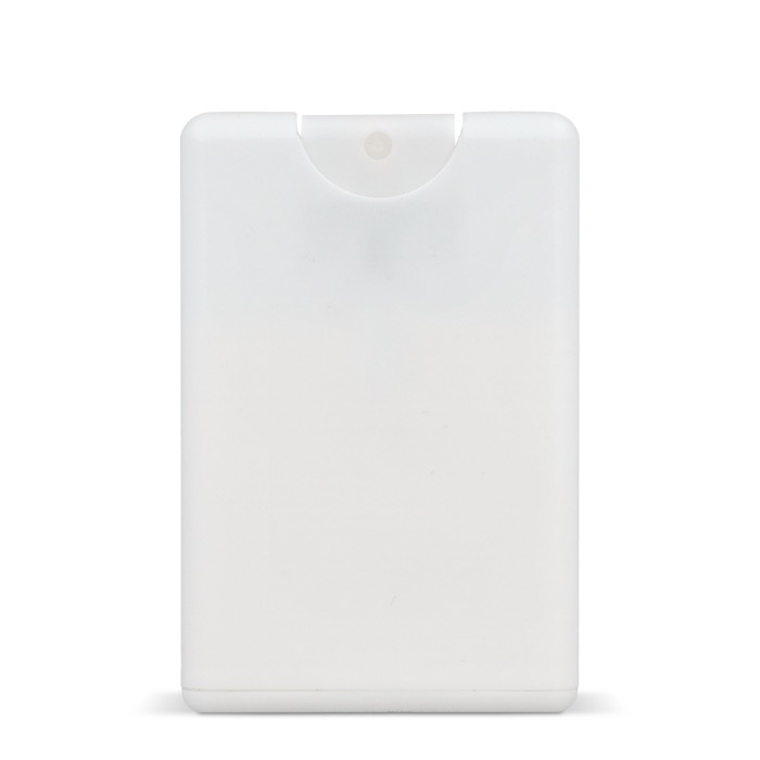 Pulverizador FPS30 compacto numa embalagem em forma de cartão de crédito com plástico reciclado. Estrutura fina que cabe facilmente num bolso ou carteira. Ampla zona para a marca na frente. Ideal para brindes e eventos ao ar livre.