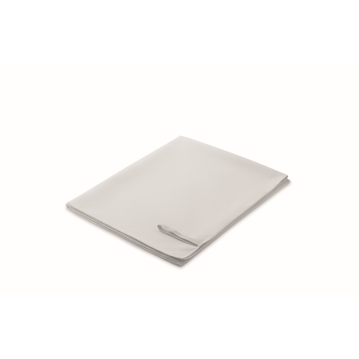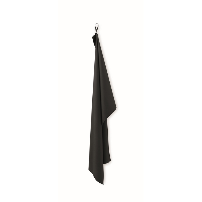 Toalha de microfibra de 90% poliéster e 10% poliamida, desenhada para uso prático no dia a dia. Inclui uma tira elástica para pendurar e facilitar a secagem e armazenamento. O tecido é leve e ajuda a reduzir o tempo de secagem entre utilizações, o que a torna cómoda para deslocações. Com tamanho de 70 x 120 cm, oferece uma superfície ampla sem ocupar demasiado espaço. Recomendável para kits de desporto ou eventos.