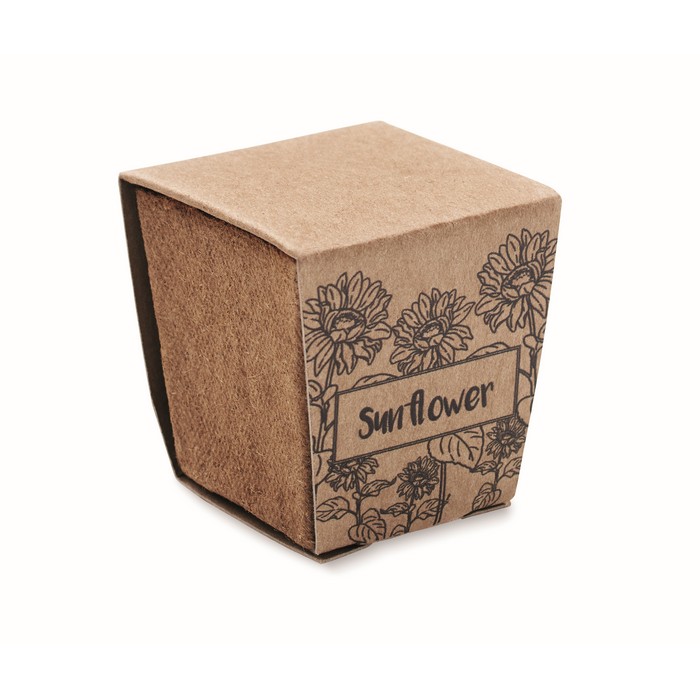 Cultive a imagem da sua marca com este vaso biodegradável com sementes de girassol. Inclui parcela de terra, feita na UE. Ecológico e promocional.