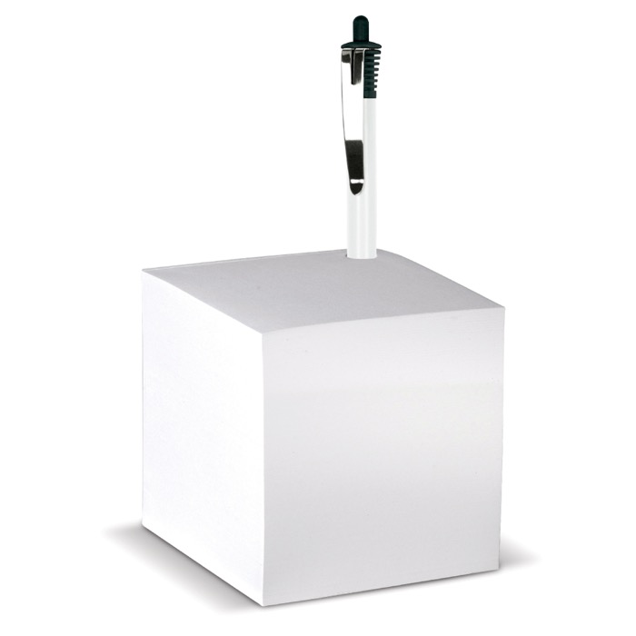 Cubo de notas de 840 folhas de papel branco e certificação FSC. Proporciona organização, visibilidade e sustentabilidade num só brinde empresarial.