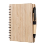 Bloco de notas em bambu. Tamanho aproximado A6, 140 páginas pautadas de papel reciclado 70gsm. Bloco de argolas. Incluí uma esferográfica em bambu. Escrita azul, sistema pulsar. Ambos os itens são personalizáveis.