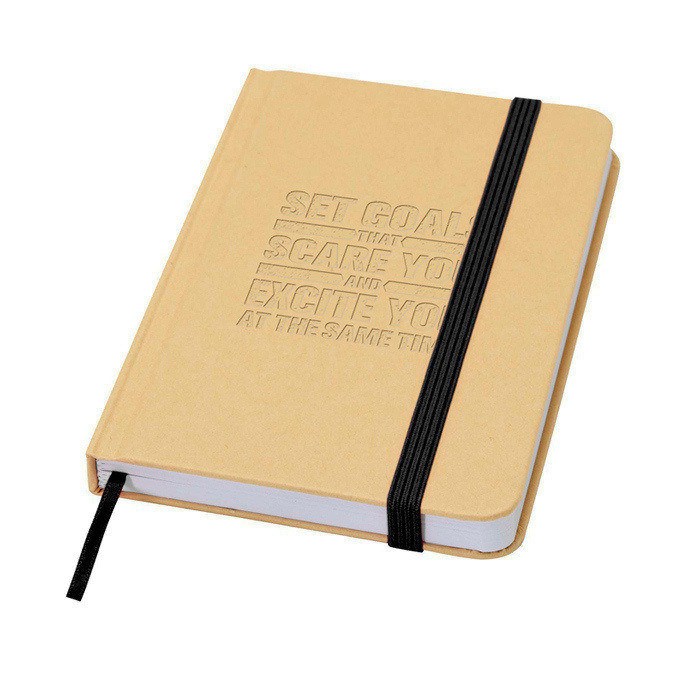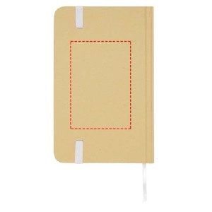Caderno de cartão reciclado (aprox. A6) com 160 páginas pautadas, marca-página e fecho com elástico.