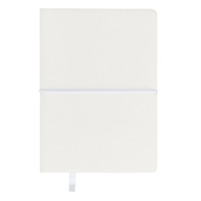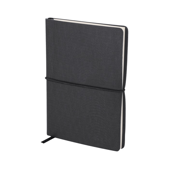 Caderno com capa de PU reciclado. Capa flexível com fita de fecho elástico e marca-página colorido. Contém 80 folhas de cor creme, pautadas. Inclui 25 notas adesivas médias em cor amarela e 125 notinhas adesivas em cores várias. Inclui selo de PU reciclado.