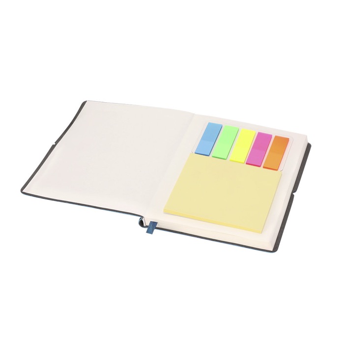 Caderno com capa flexível e fecho elástico, 80 folhas pautadas e notas adesivas coloridas de vários tamanhos. Dê asas à criatividade de clientes/colaboradores!