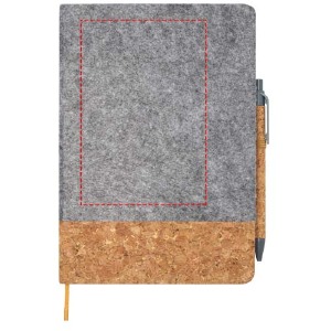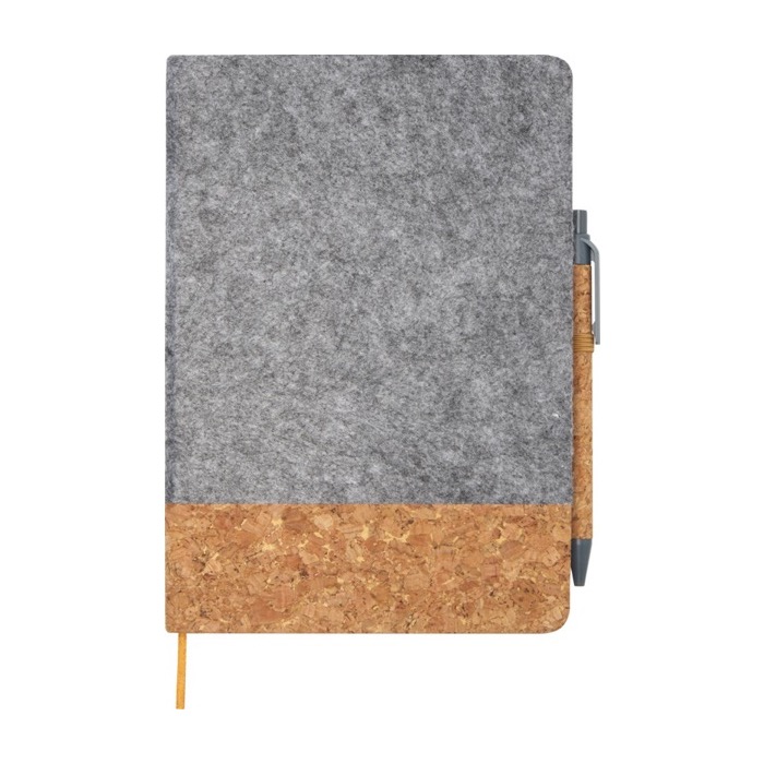 O bloco de notas A5 de capa dura é feito de cortiça e feltro reciclado e tem 80 folhas pautadas de papel de 70 g/m², fecho elástico, marcador de fita e argola para caneta. O botão, o clipe e a ponta da esferográfica são de plástico reciclado e o corpo é de cortiça. Tinta de caneta: Preto. Comprimento de escrita: 600 metros. Tamanho do bico: 1,0 mm.